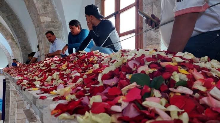 La producción de estos pétalos multicolores se debe al cultivo local de rosas, que florecen en la región. Además, floricultores de áreas cercanas como Capula, Carboneras, El Puente, La Estanzuela y Cimbrones aportan pequeñas hojas para el evento...